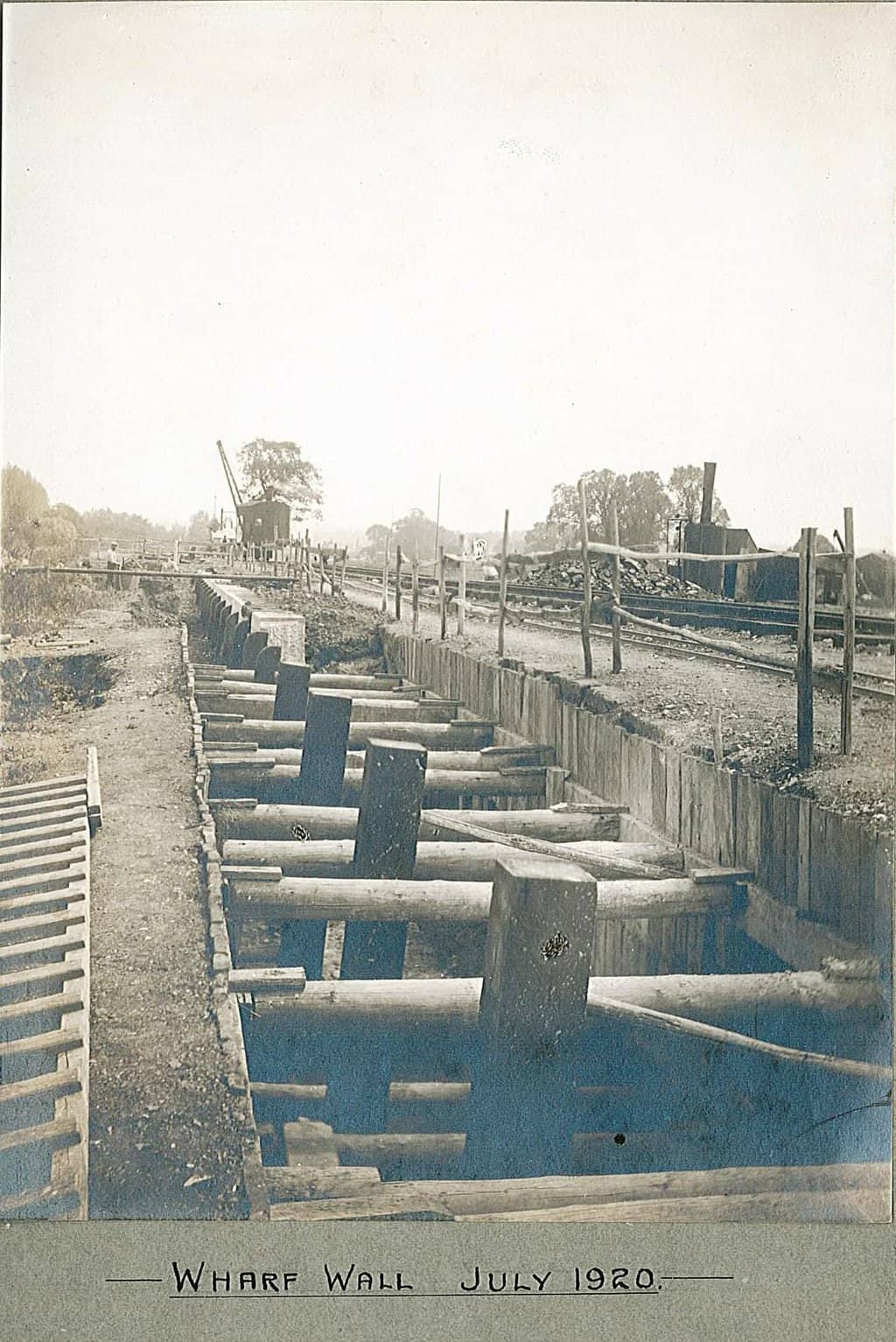 Photos 1 and 2 depict the commencement of building the wharf along the Medway middle cut, where the banks on the west side were cut back and the spoil used to fill in around the Ferry House Inn visible just beyond the crane. Standard gauge steam crane, narrow gauge tracks and V skip wagons used to move materials around the site – much as dumper trucks are used today.