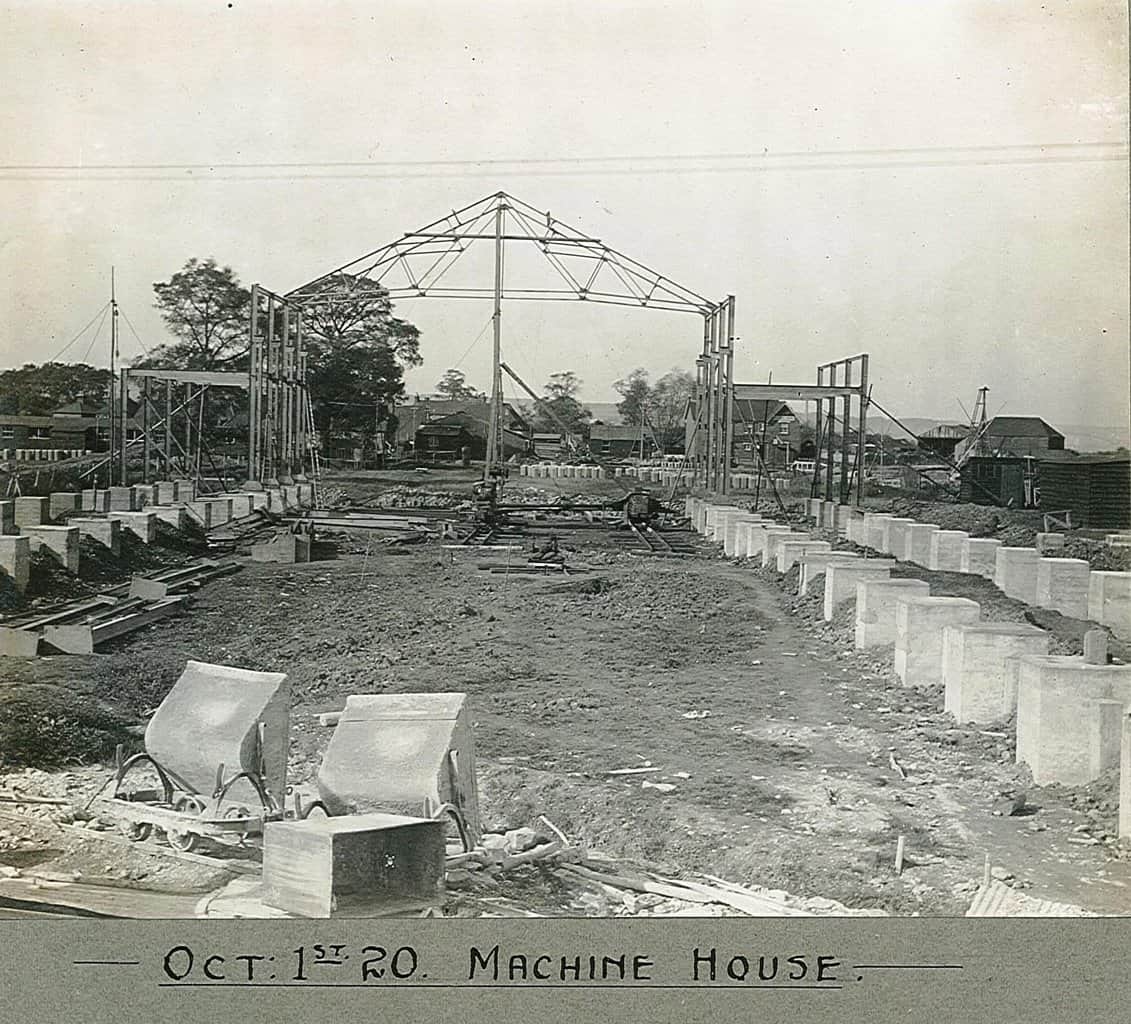 7. Machine house frame steel work being erected. The pole derrick to lift the roof trusses is mounted on narrow gauge wagon chassis so it can be moved from frame to frame, it is ballasted with piles of bricks. The Ferry is visible through the frame of no 1 mc annexe. That may be a pile driver beyond, putting in piles for the wharf beyond the Ferry, which will be filled in later with spoil from the pulp yard wharf.