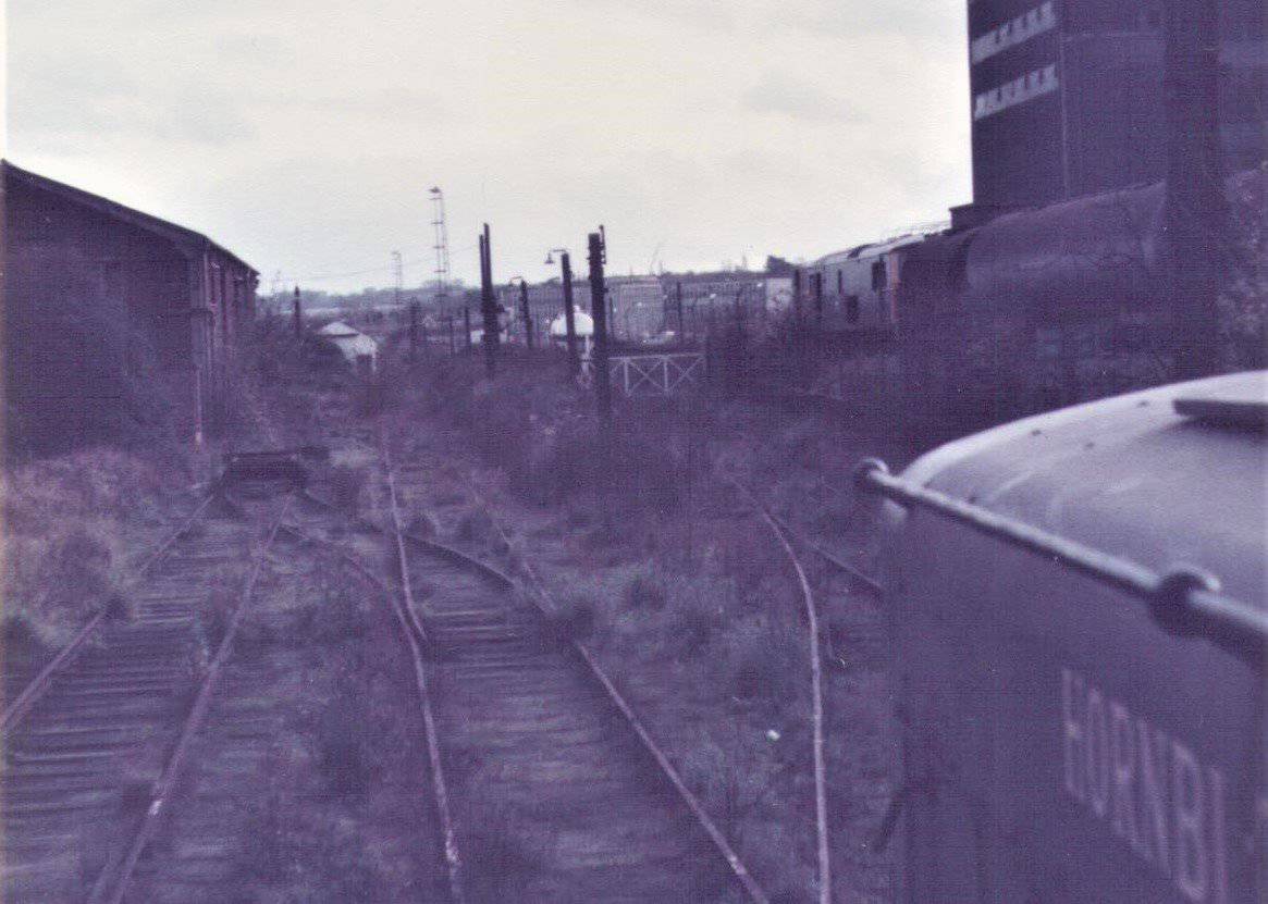 Standard gauge and narrow gauge track in evidence. As the NG in particular was moved around to suit the requirements of the building work, it was treated much like model railway sectional track, pick it up and lay it down where needed. The SG trolley visible in this photo (there were maybe more than 1), appears in later photos and looks remarkably like one which still existed in the early 80s by the water tower and east mill rail weigh bridge. It’s just about discernible in this rather poor photo I took as one of a series when we sent away the last chlorine tanker to be used on site.