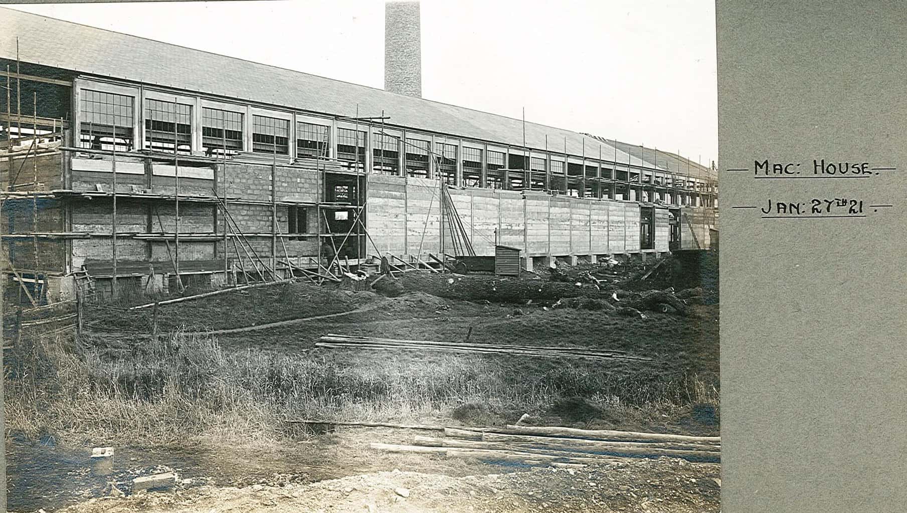 29. Machine house, most of the window frames in place and glazing in progress. Most of the annexe walls are of poured concrete, the shuttering lines clearly visible. Other panels are of blockwork, to allow windows etc to be fitted. The blocks were possibly made on site as there are some in front of the Winget plant in photo 3. The low natural ground level can be seen in relation to the concrete beams at machine house floor level.