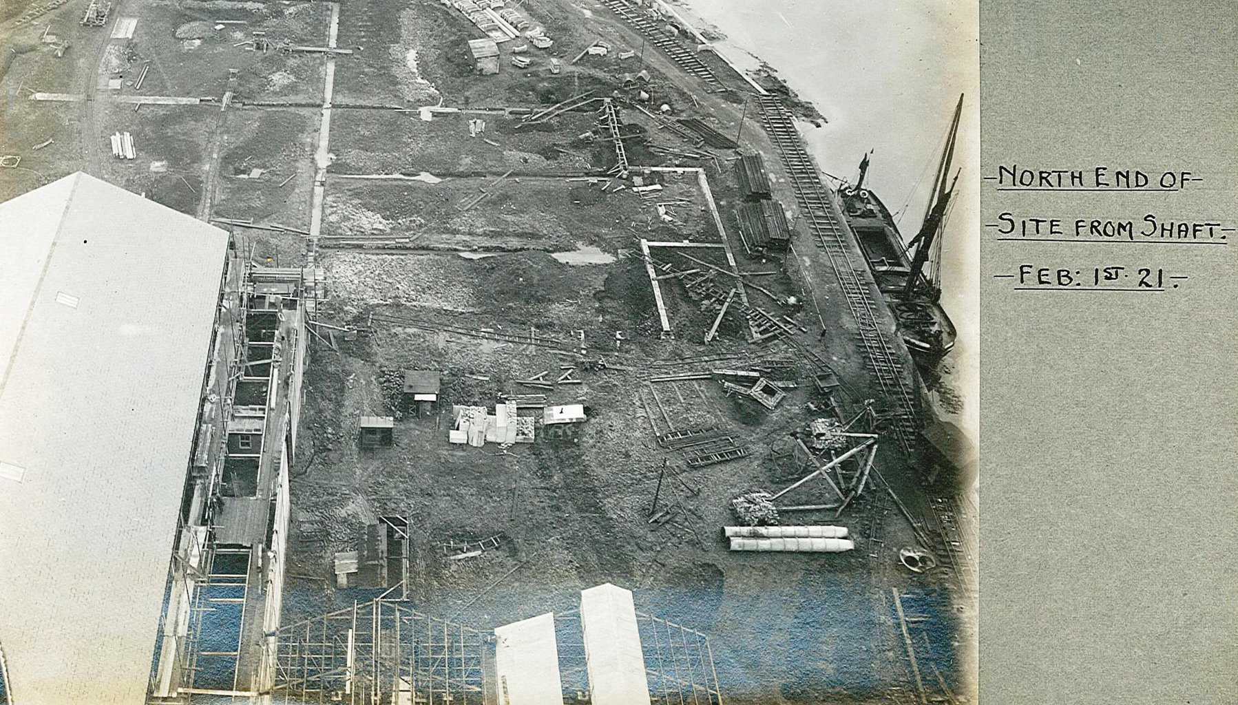 33. A closer view of the Fitters’ shop and Salle foundation area seen in 31. Interesting items here include the Lancashire boiler parts – two fire tubes and a firehole plate, which suggest a second hand boiler being reused here (compare also the scruffy looking boiler in a previous shot), new boilers would normally be delivered complete (we had in the family a series of photos showing the delivery of a new boiler to Lower Tovil mill by rail, rolling off down the embankment and transfer onto a trolley pulled by a traction engine into the mill, unfortunately now lost) and often with the makers’ name emblazoned on them. Mixed SG and NG track along the wharf with the SG steam crane possibly loading spoil from the bank excavation into a V skip wagon for delivery to raise the ground level under the rather dodgy looking NG track within the salle area. Stacks of NG track panels and various track panels laying about including an upside down point on the SG track by the river – looks a bit like my layout under construction!