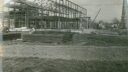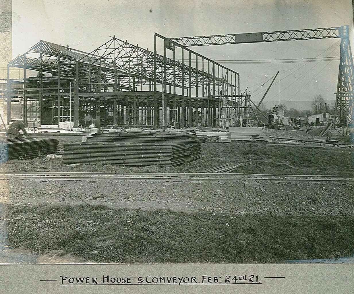 Steelwork for no 1 conveyor well advanced. Stacks of window frames in the foreground adjacent to what appears to be a standard gauge siding.