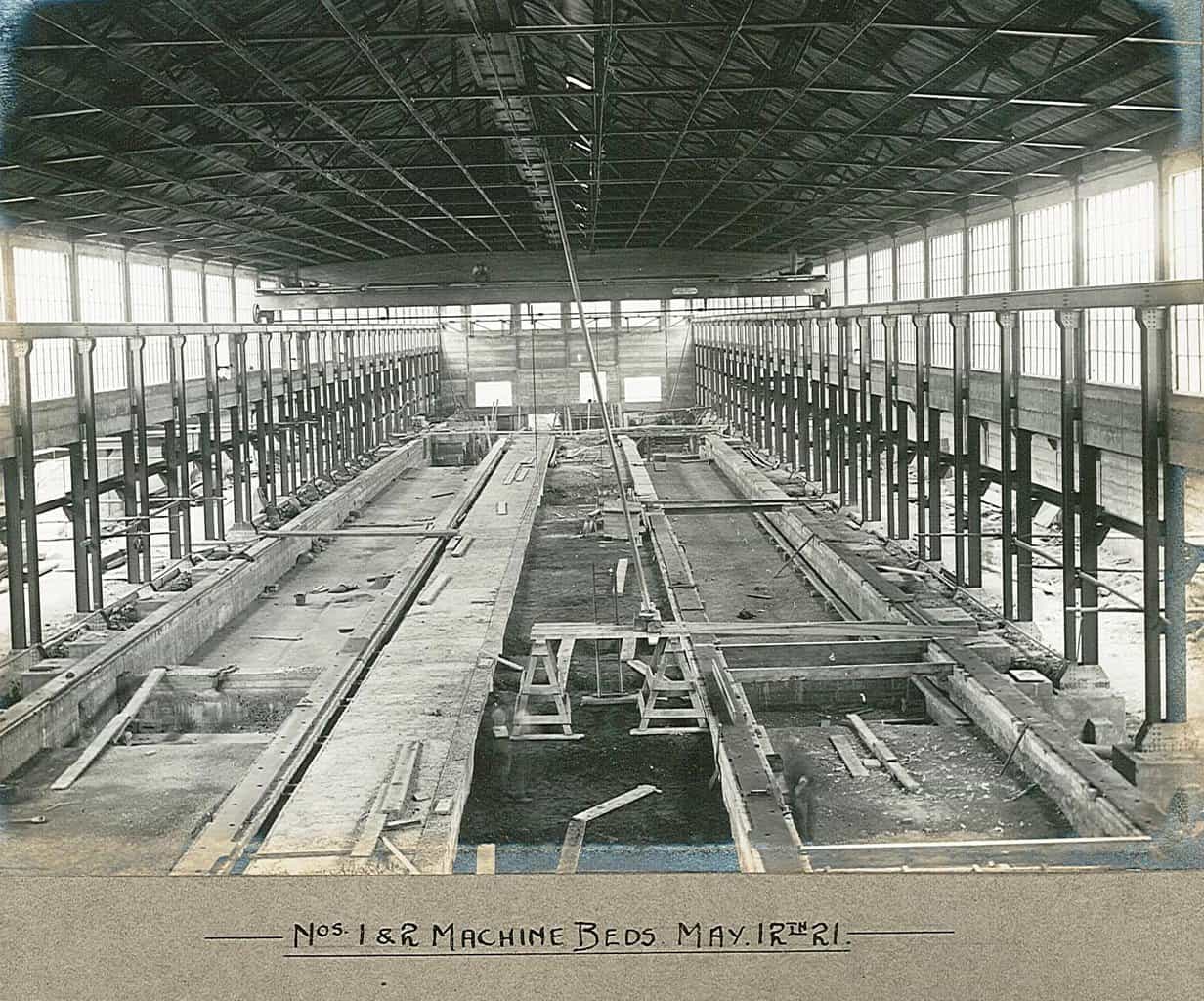 Taken from the beater floor door / top of the machine chests. No 2 sole plates in place, no 1 sole plates partly laid out but not yet aligned or fixed down. The ceiling has progressed, men working in a recumbent position from a staging on top of the crane bridge. Access via the ladder looks very precarious, though the foot of the ladder appears to be secured by battens fore and aft on the baulks.
