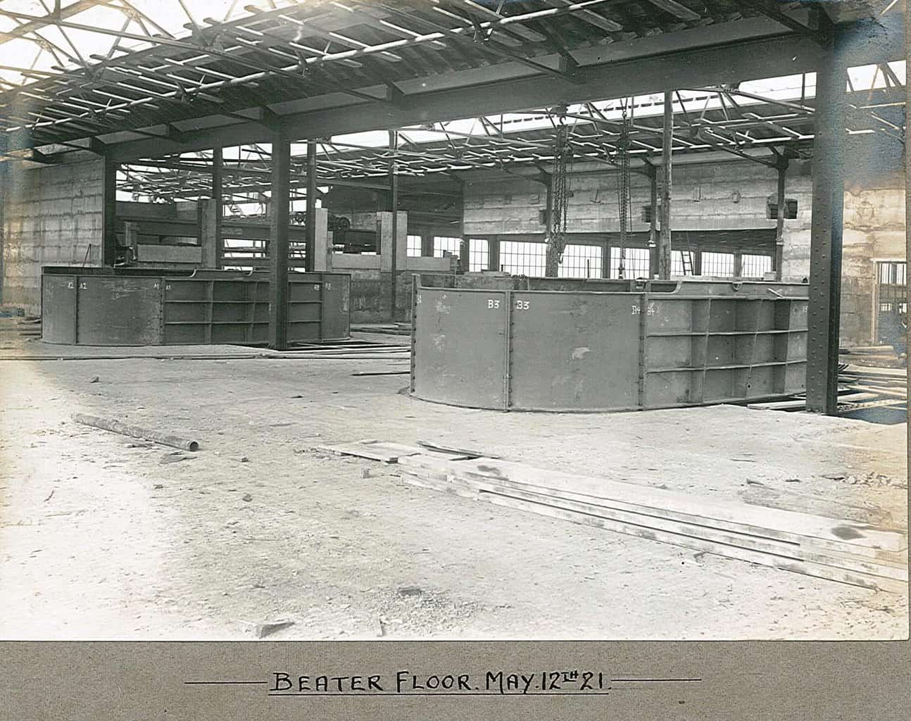 This is the upper level of the beaterfloor, looking roughly north west away from the river, through the incomplete wall can be seen the south end of the machine house, and over to the left, the end of the turbine house. Two pulp breaker tubs are in place. Gaps in the floor may be for the belt drive to come up from the mainshaft in the lower level.