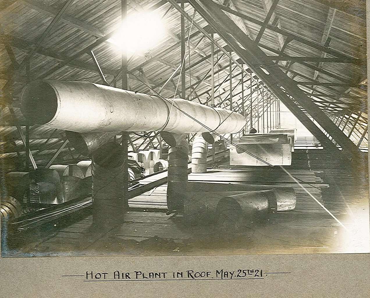 This is the ducting for supplying hot air to the underside of the ceiling to prevent condensation dripping – potentially drips woulf disrupt the formation on the wire. I think this is a view south from memory of a couple of excursions into the roof when we installed insulation (some sort of shredded fibre material) in the early ’80s. The narrow walkway down the centre is visible, and was all that was present in the ’80s. The planking under the duct pieces is probably temporary during the installation, it was not present later. Access to the lamps in the ceiling was quite precarious I recall, the electricians had to inch their way out along the roof trusses to reach the lamp housings.
