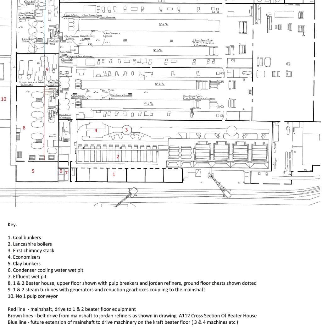 This is an extract from a plan dated sometime after the mid 30s when all the East Mill machines were in place, but before the rebuild of no 3 and the removal of no 4, so probably mid 50s.