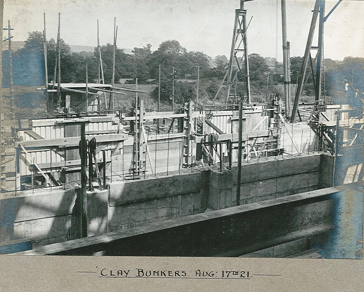 Substantial support work for the shuttering to cast the clay bunker walls. On the right one of the A frame legs of no 1 pulp conveyor is being erected, by means of the pole hoist visible just to its left.