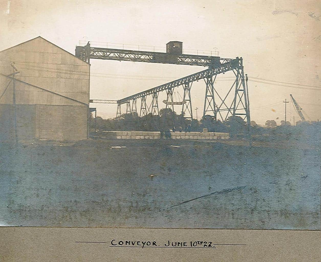 Pulp stacks being built, the temporary corrugated iron upper wall to the powerhouse and beaterfloor range on the left, later opened up when the powerhouse was extended and the kraft beaterfloor constructed.