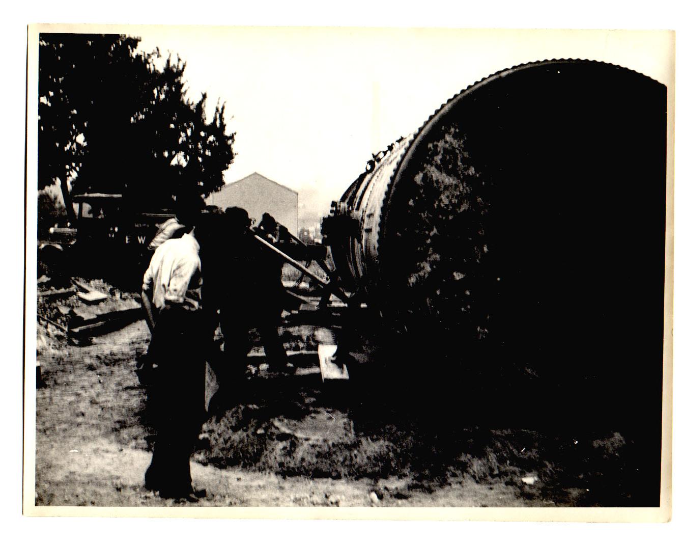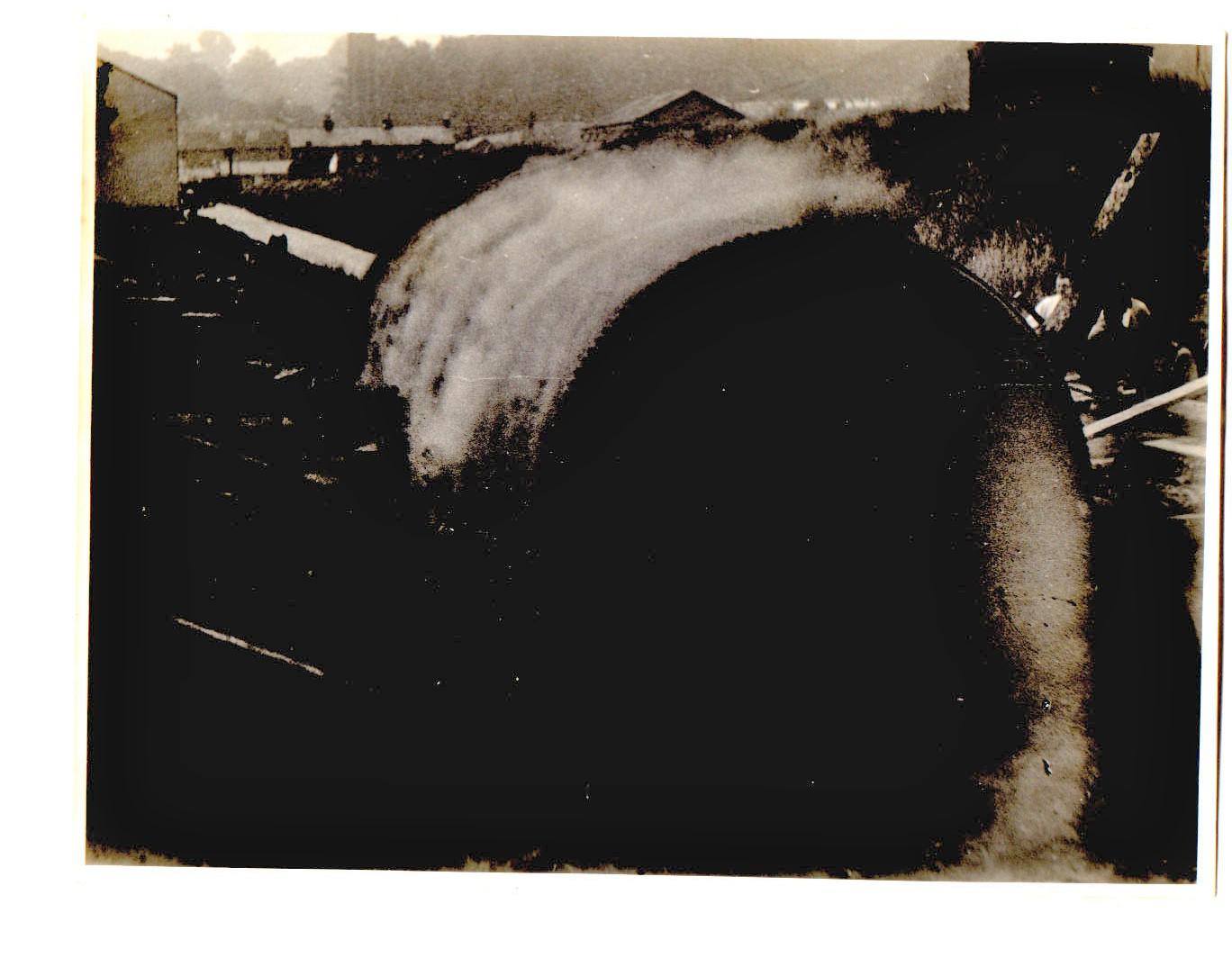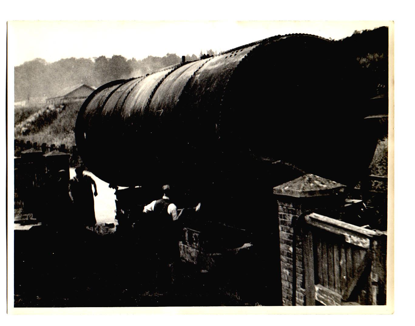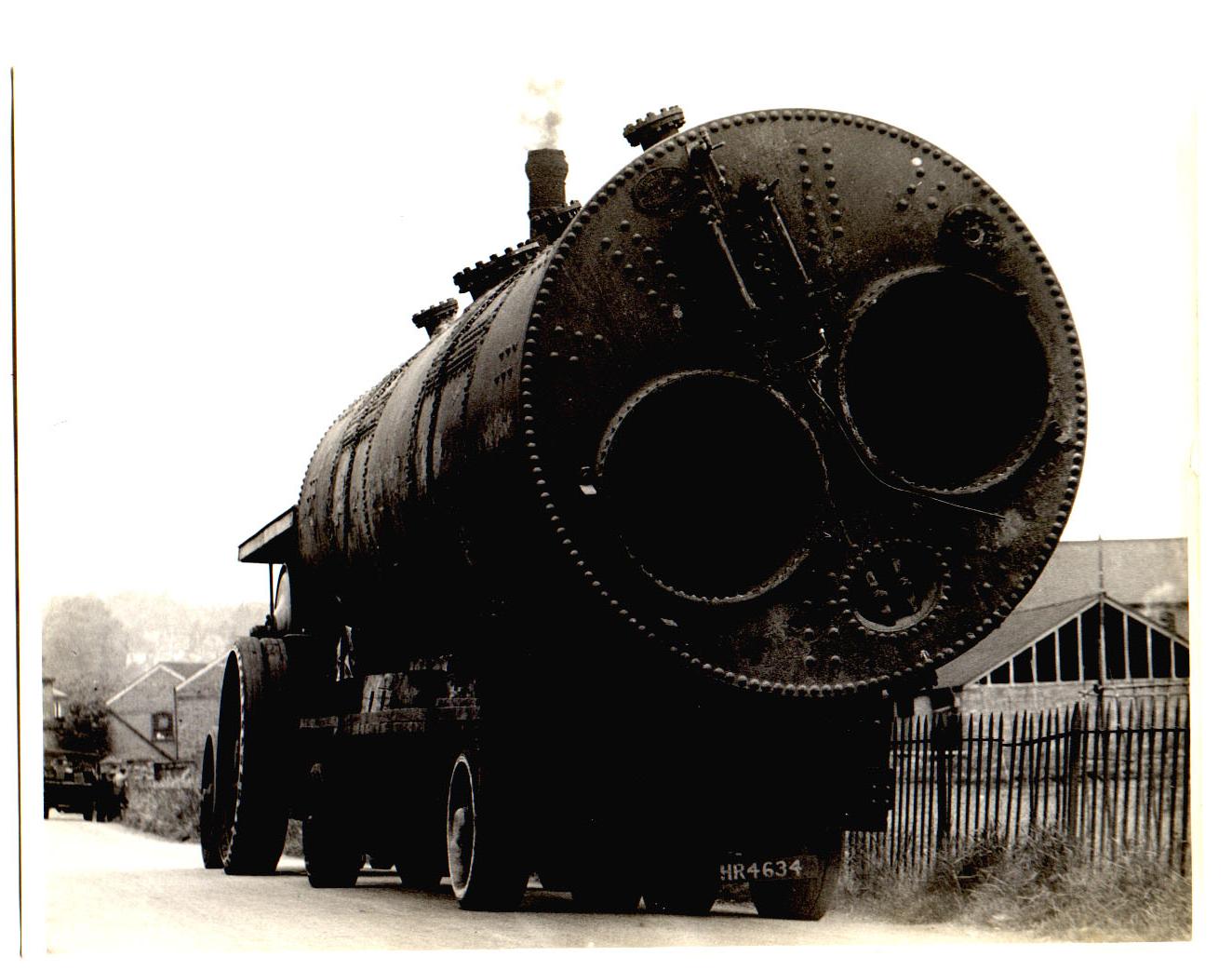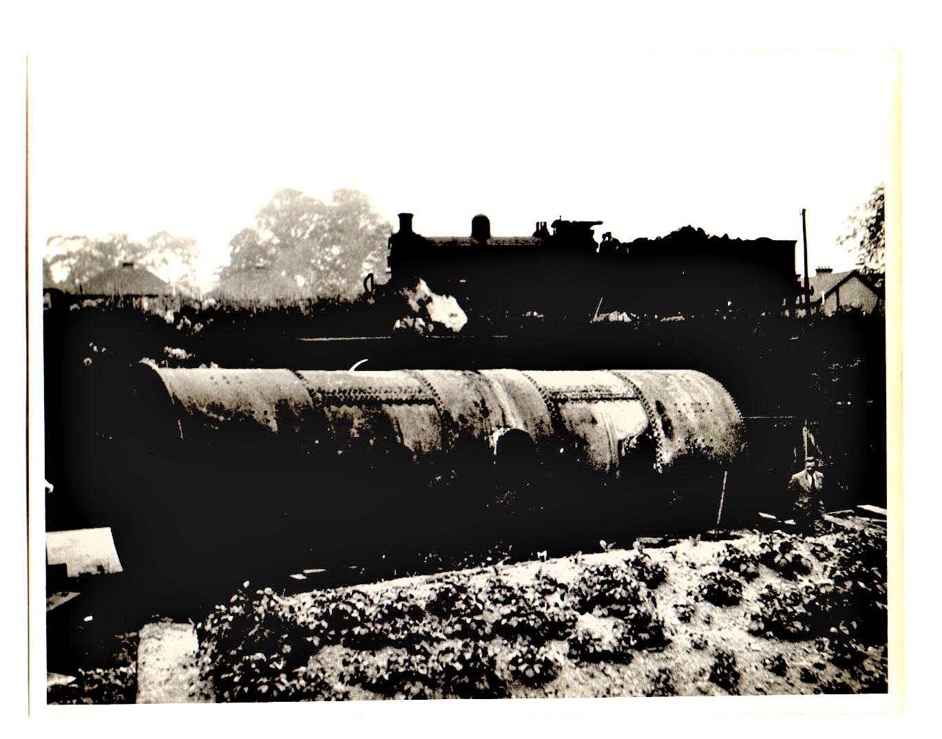 No 1. Boiler on the lane, ready to be loaded onto road transport, the Tovil goods branch embankment behind and allotments in the foreground.