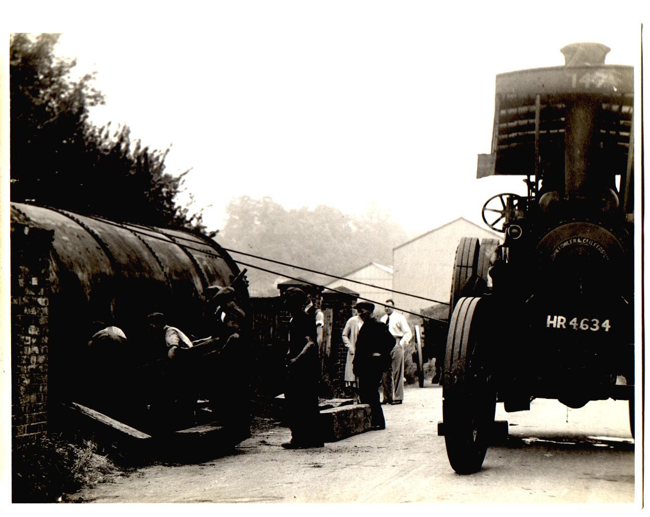 No 2. Winching and jacking the boiler onto the road trailer, shackles on the winch cables from the traction engine visible on the boiler shell, jacks and packing to the left. View is towards the bottom of Tovil Hill and Upper Tovil mill (Reeds). The corrugated iron shed visible is part of what was, or became RCC Tovil.