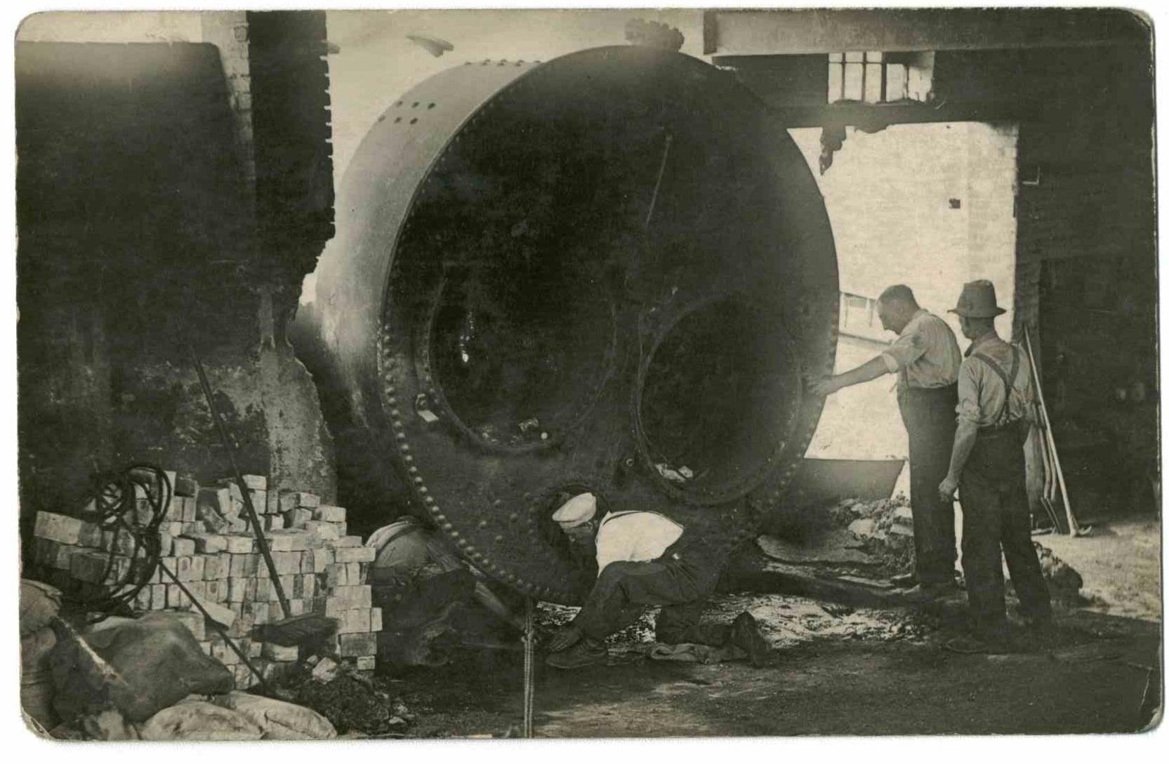 This photo was not part of the set above but one of a few other photos and post cards in the family collection at the time, the building looks like it has been subject o some demolition to get the boiler in. New firebricks are stacked alongside. The two men rather precariously occupied under the end of the bloier appear to be adjusting packing to slide it over, the winch cable / chain leads towards the photographer.